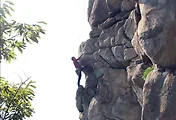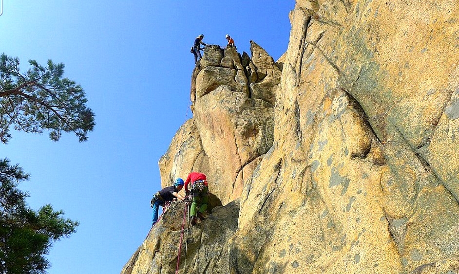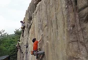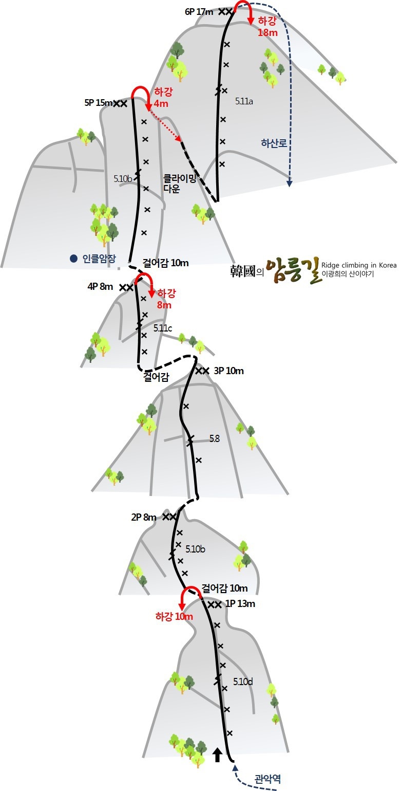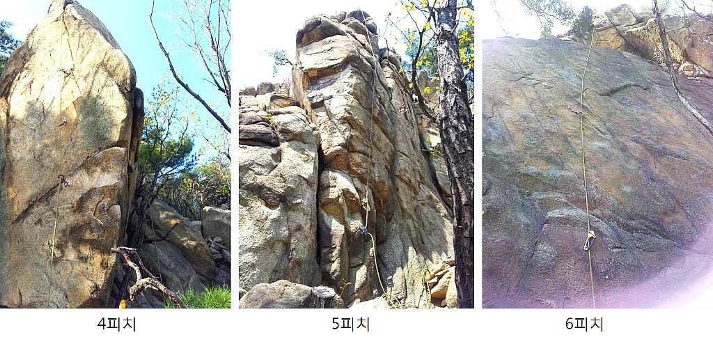 5피치 퀵드로우6개 - 15미터. 난이도5.10b, 등반후 우측 소나무방향으로 4미터 하강(흔들바위있음).