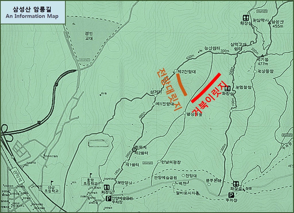 관악역에서 삼성초교 앞에서 좌측으로 관악현대홈타운 아파트를 지나면 삼막동과 금강사가 나오는데 이곳에 주차가 가능하다. 이어 학우봉능선으로 전망바위를 지나 갈림길에서 동쪽능선으로 조금 내려서면 거북이릿지 초입에 다다른다.